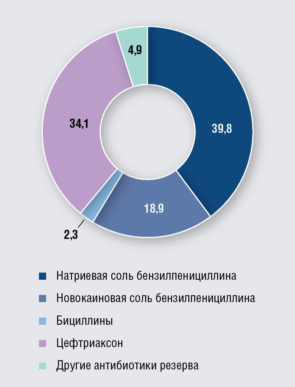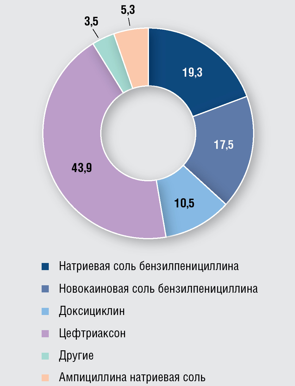 То же самое можно сказать и о результатах дополнительной антибиотикотерапии, проведенной пациентам с СР и ЗН РМПс: она не оказала положительного влияния на дальнейшую негативацию реакции. Дополнительное лечение не дало результата, вероятнее всего потому, что в 50,9% случаев его проводили с нарушением требований Федеральных клинических рекомендаций. Оптимальной в случаях СР является терапия натриевой солью бензилпенициллина, вводимой внутривенно капельно по 24 млн ЕД/сут в течение 20 дней, а в случаях непереносимости пенициллина — цефтриаксоном внутримышечно по 2 г/сут 20 дней. По данным нашего исследования, дополнительное лечение пациентов с коинфекцией осуществляли чаще всего цефтриаксоном (43,9%), в 36,8% случаев использовали антибиотики, не рекомендованные к применению при СР, и лишь 19,3% пациентов лечили натриевой солью бензилпенициллина (см. рис. 2).