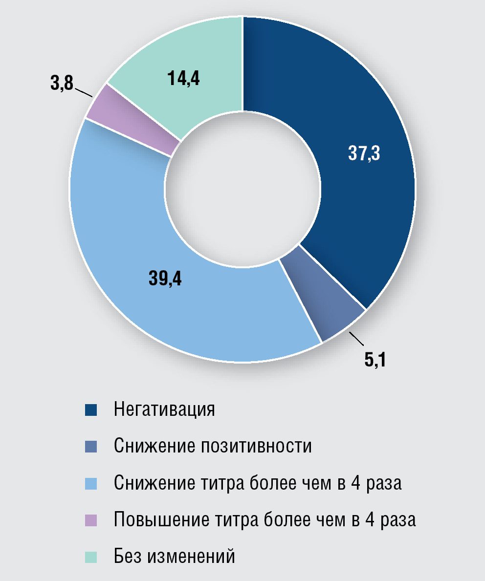 Анализ результатов лечения сифилиса у пациентов с ВИЧ-инфекцией. Согласно нашим данным, у ВИЧ-инфицированных пациентов негативация РМПс в течение 12 месяцев после окончания первичного лечения сифилиса произошла лишь в 37,3% случаев. У 14,4% РМПс оставалась резкоположительной без тенденции к снижению титра антител (сформировалась СР). У 44,5% участников исследования в течение первого года наблюдения либо было отмечено снижение степени позитивности РМПс, либо при ее резкоположительном результате произошло снижение титра антител в 4 раза и более, т.е. имела место ситуация, трактуемая как ЗН РМПс и требующая пролонгирования периода КСН. У 3,8% участников исследования в период КСН было зарегистрировано четырехкратное и более повышение титра РМПс, которое у 1,3% пациентов было обусловлено реинфицированием сифилисом, а в 2,5% случаев — расценено как серологический рецидив и неудача терапии.